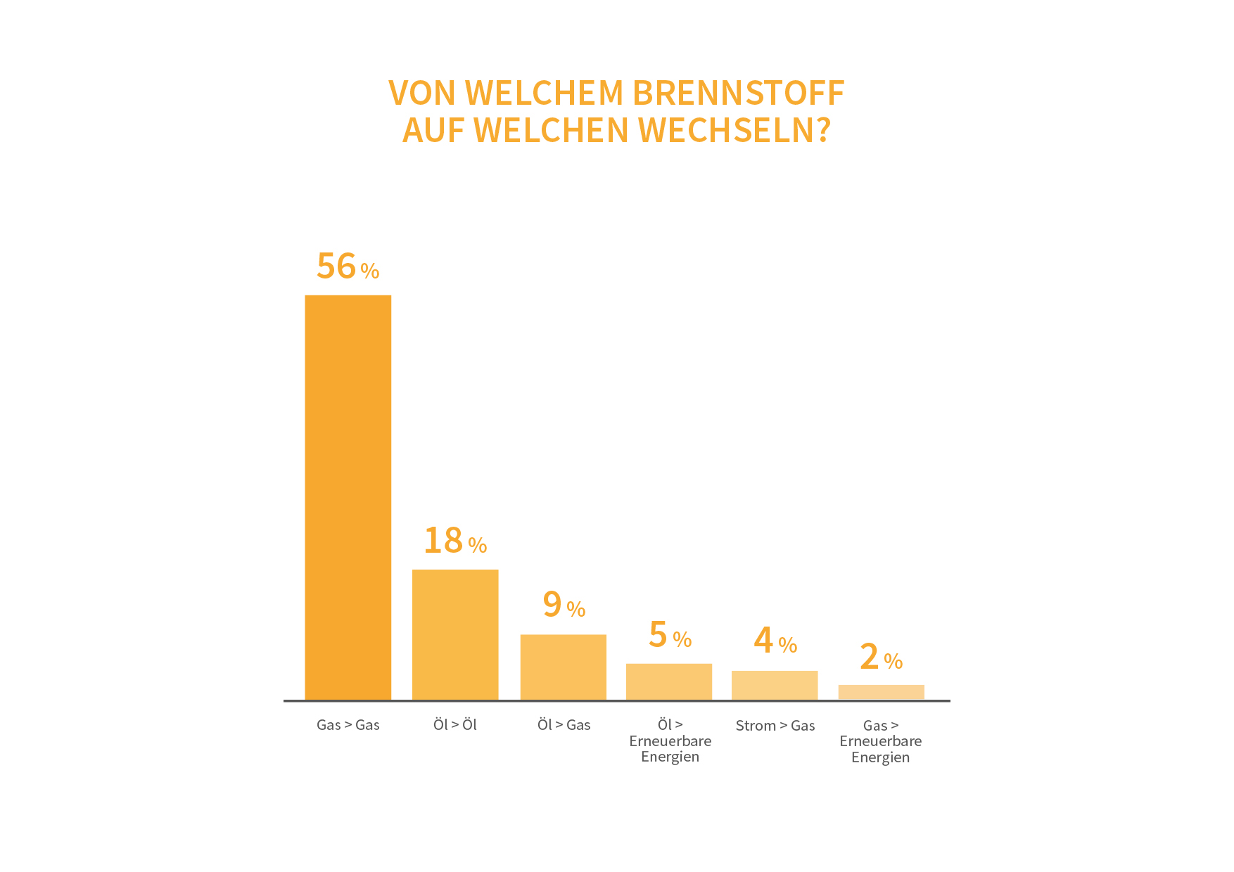 67 % geben an bei der neuen Heizung mit Gas heizen zu wollen. 19 % setzen auf eine ölbetriebene Heizungsanlage. Erneuerbare Energien hingegen fristen mit etwas über 10 % weiterhin ein Schattendasein in deutschen Heizungskellern. Etwas höher fällt hingegen mit 21 % das Interesse an einer solarthermischen Anlage zur Heizungsunterstützung aus.
