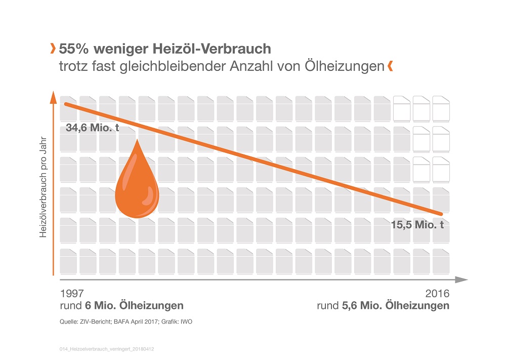 Trotz fast gleichbleibender Anzahl der Ölheizungen hat sich der Verbrauch von Heizöl seit etwas mehr als 20 Jahren mehr als halbiert. Quelle: ZIV/BAFA, Grafik: IWO