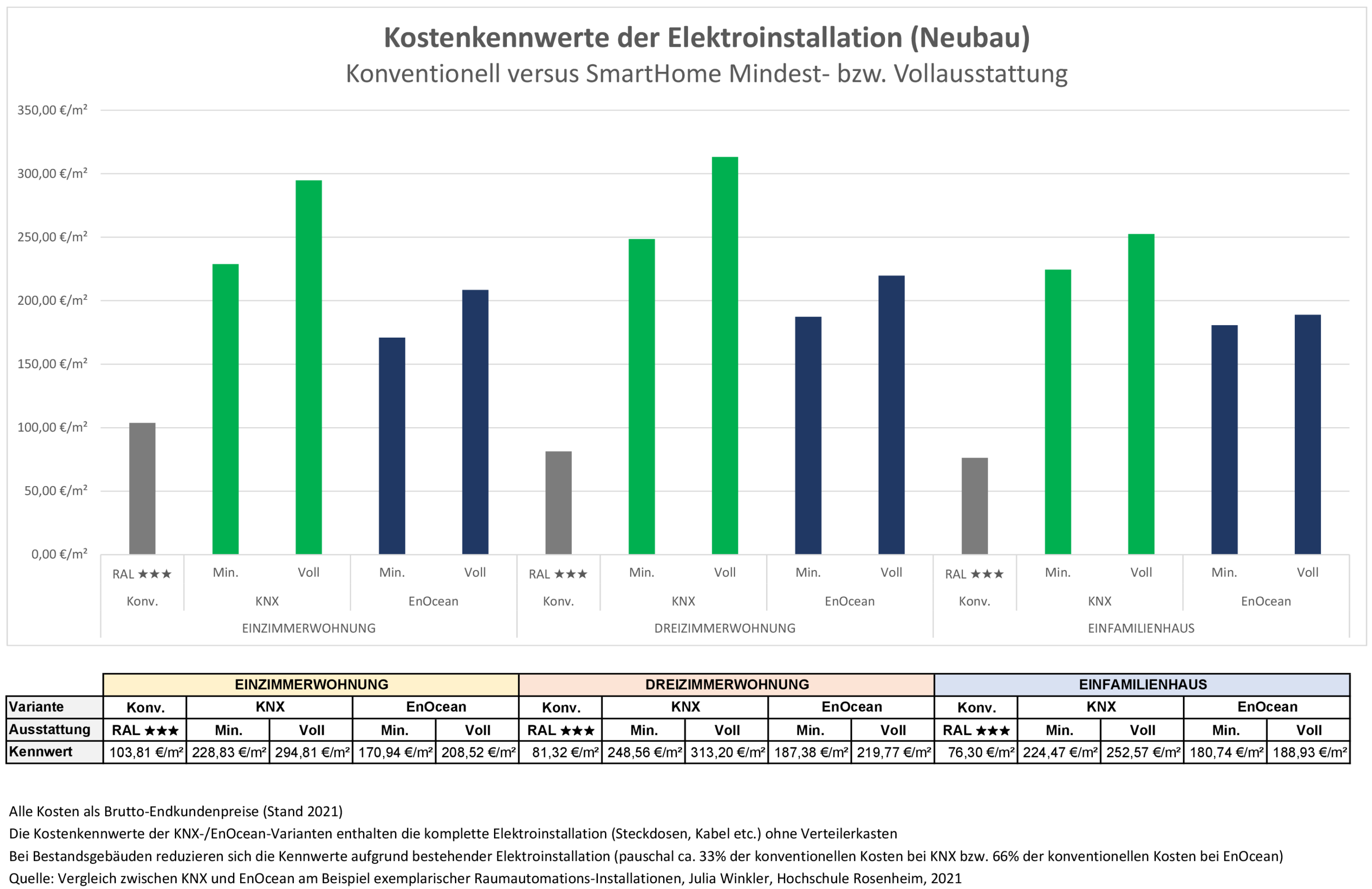 Wichtig zur korrekten Interpretation der Kennwerte ist zu beachten, dass die Kosten für erforderliche Steckdosen und Kabel ebenso bei den SmartHome-Varianten enthalten sind. Somit sind für eine Kostenschätzung eines Neubauvorhabens entweder die Kennwerte einer SmartHome-Variante oder die Kennwerte einer klassischen Variante zu berücksichtigen – nicht aber beides additiv.