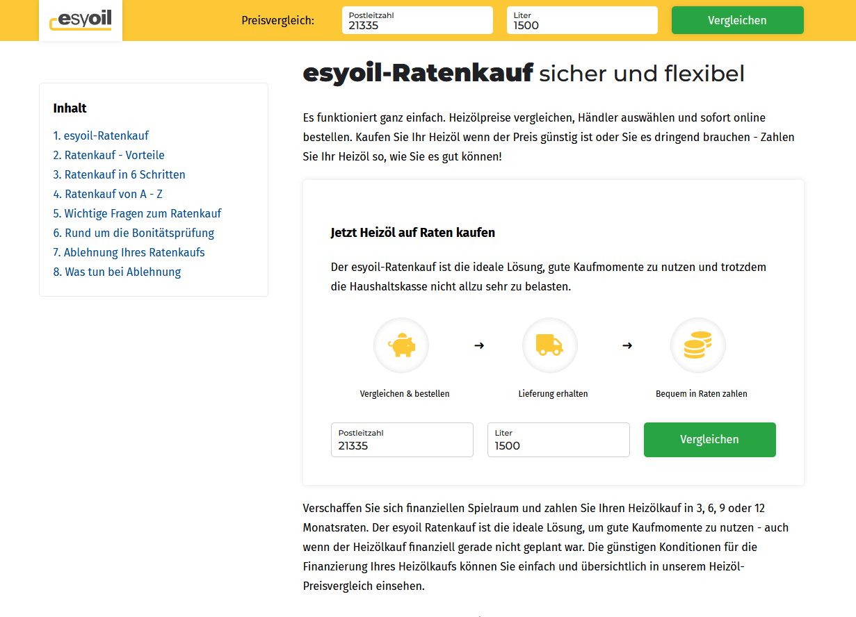 Der Ratenkauf bei esyoil verläuft ähnlich einfach wie bei anderen Vergleichsportalen. „Heizölpreise vergleichen, Händler auswählen und sofort online bestellen. Die Kunden können ihr Heizöl kaufen, wenn der Preis günstig ist oder sie es dringend brauchen. Zahlen können sie dann, wie sie es eben können“, erklärt Tobias Ossig-Lach, Geschäftsführer von esyoil. Die Raten können sich über drei, sechs, neun oder zwölf Monate erstrecken. …