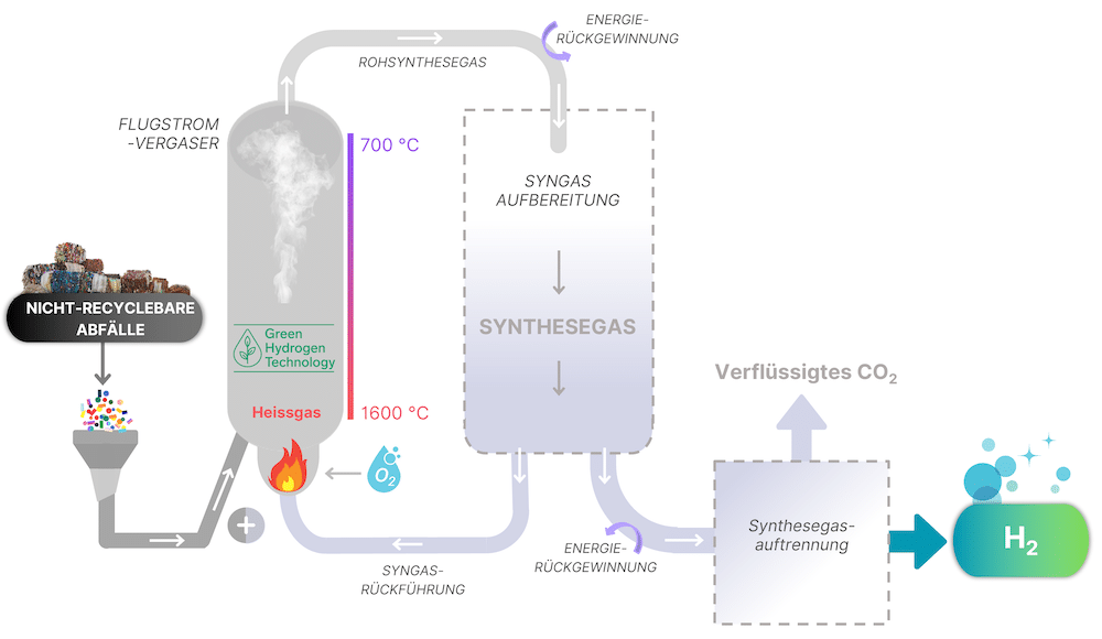 Das Verfahren besteht aus drei Phasen: Synthesegaserzeugung, Synthesegasreinigung und Synthesegasauftrennung. In der Anfangsphase wird das prozesseigene Synthesegas zusammen mit Sauerstoff verbrannt, wodurch Heißgas von 1.500 bis 1.700 Grad Celsius entsteht. Anschließend wird im Rahmen des patentierten ChemQuench-Verfahrens Kunststoff in diesen Heißgasstrom eingebracht und vergast, wodurch ein wasserstoffreiches Synthesegas entsteht. …